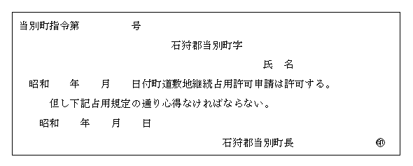 第4条の2 道路占用の許可を受けた者はその占用にかかる工作物、物件又は施設の見易い箇所に許可番号、許可年月日、占用箇所、占用面積、占用目的、占用期間及び占用者の住所氏名を表示しなければならない。但し別に町長が定める許可標識票を添付した広告物の類についてはこの表示を省略することが出来る。