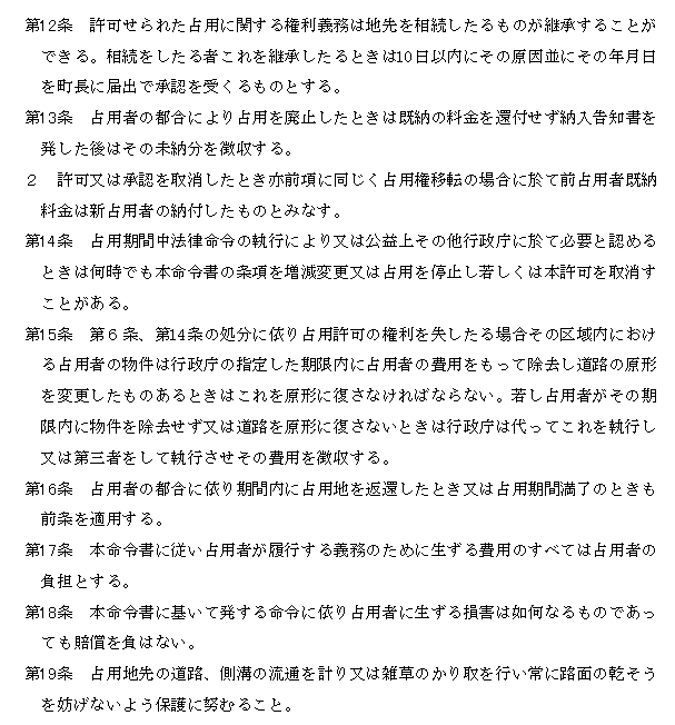 第5条 占用の許可を受けた者であって住所又は氏名を変更した者及び占用の許可を受けた者から当該占用にかかる工作物、物件又は施設を譲り受け又は相続により継承した者等は町長に届出て当該許可書の書換を受けなければならない。