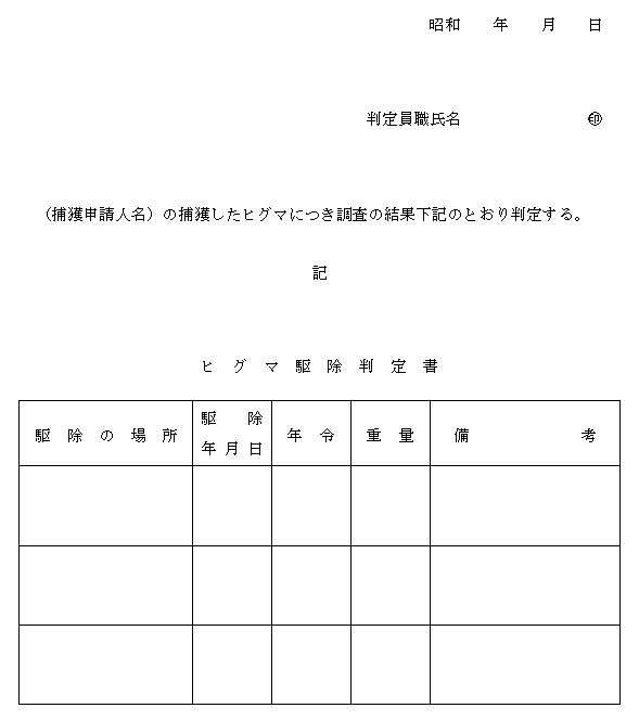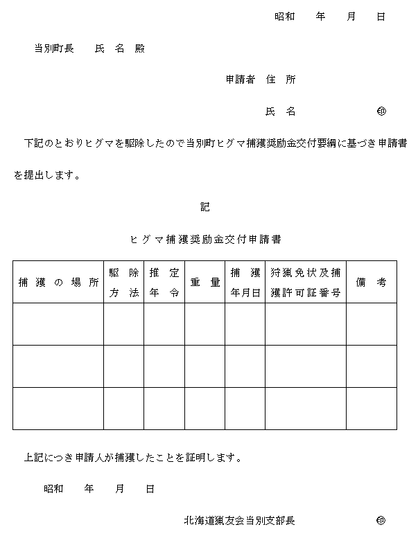 別記第2号様式の判定書を添え、猟友会当別支部を経由して町長に申請しなければならない。