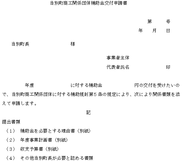第5条 補助金の交付を受けようとする団体は、町長が指定する期日までに当別町商工関係団体補助金交付申請書(