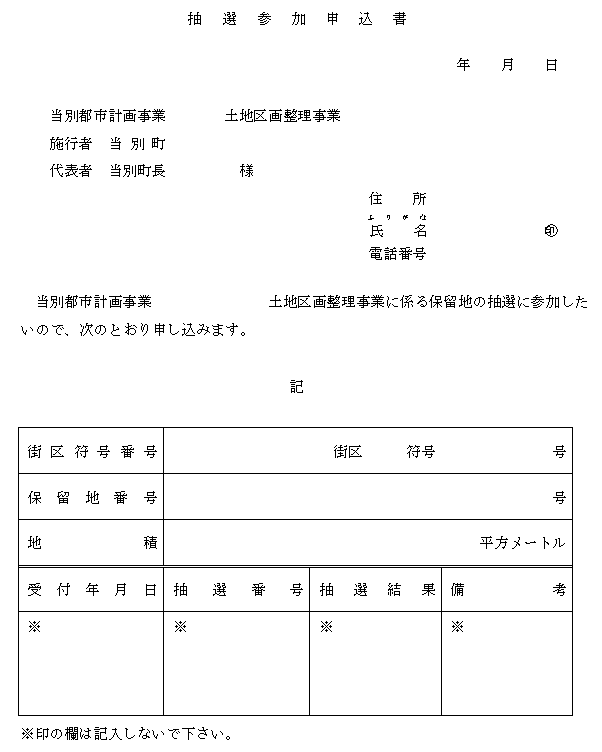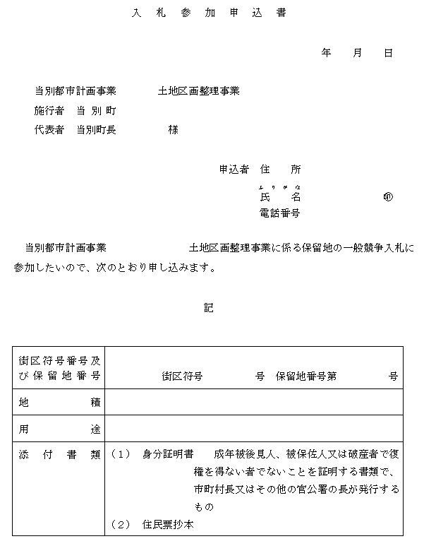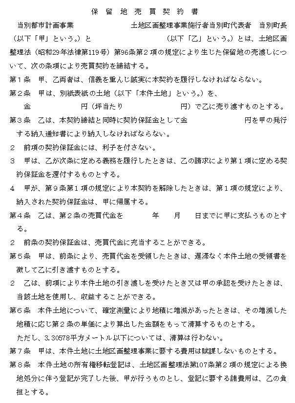 第27条 町長は、随意契約により保留地を処分しようとするときは、その相手方に保留地の所在地、地積及びその土地を必要とする理由を記載した保留地買い受け申請書(