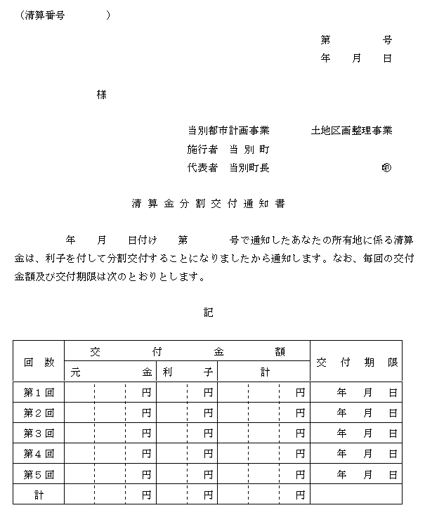 第3条 施行者は、前条の規定に基づき清算金額を決定したときは、徴収又は交付すべき者に対し、清算金通知書(