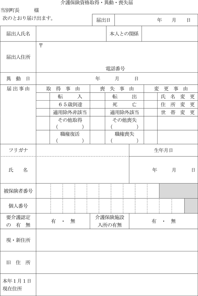 第3条 第1号被保険者又は第1号被保険者の属する世帯の世帯主は、第1号被保険者の資格の取得又は喪失の届出をしようとする場合は、介護保険資格取得・喪失届(