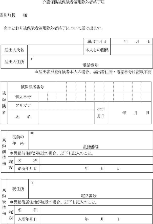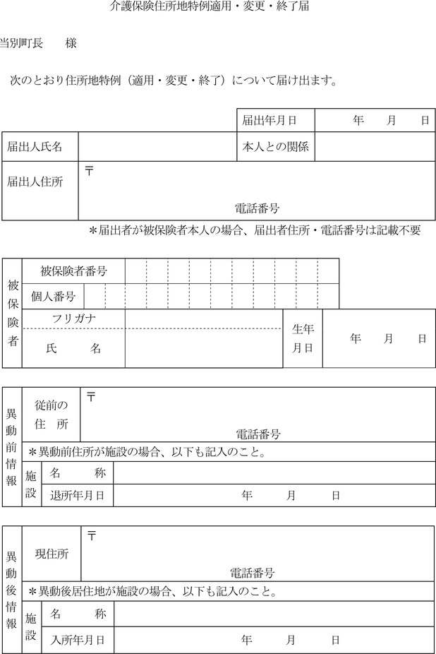 3 被保険者が、特例被保険者(介護保険法(平成9年法律第123号。以下「法」という。)第13条第1項本文に規定する者又は同条第2項各号に掲げる者をいう。以下「特例被保険者」という。)に該当するに至ったとき又は特例被保険者に該当しなくなったときは、介護保険住所地特例適用・変更・終了届(
