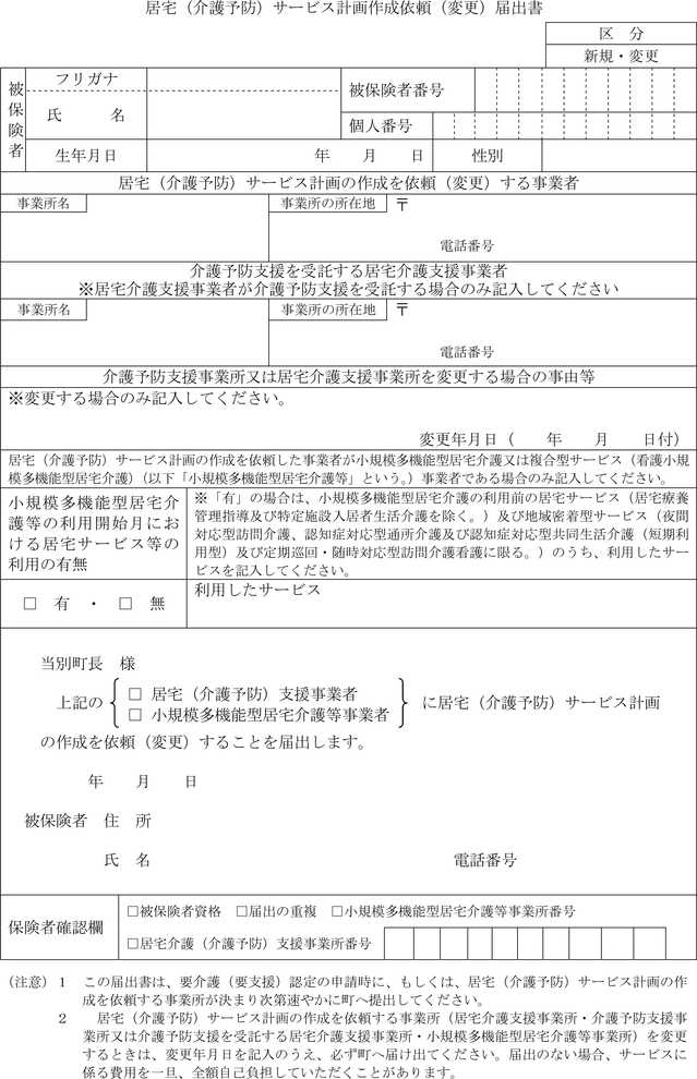 第12条 要介護被保険者等が、法第46条第4項に規定する指定居宅介護支援又は法第58条第4項に規定する指定介護予防支援を受ける場合は、居宅(介護予防)サービス計画作成依頼(変更)届出書(