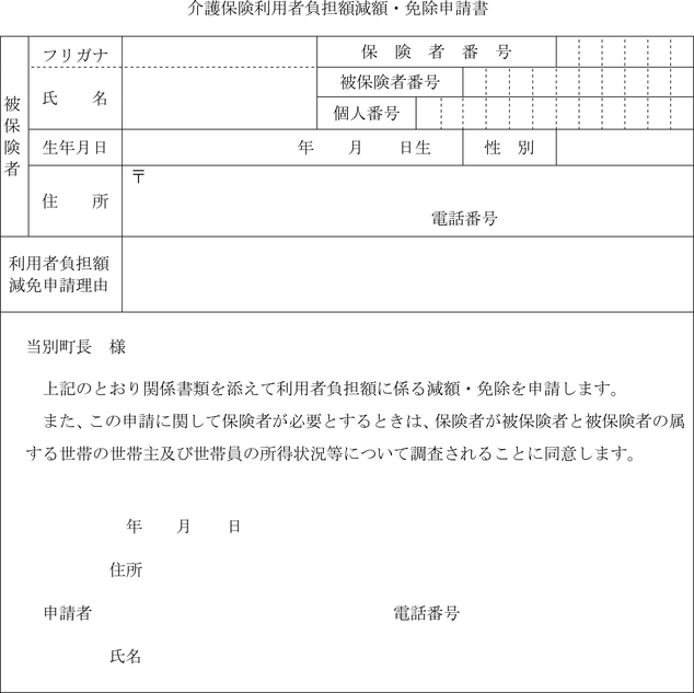 第13条 法第50条の規定による介護給付の割合又は法第60条の規定による予防給付の割合(以下「介護給付割合等」という。)の変更を受けようとする者は、介護保険利用者負担額減額・免除申請書(