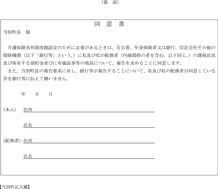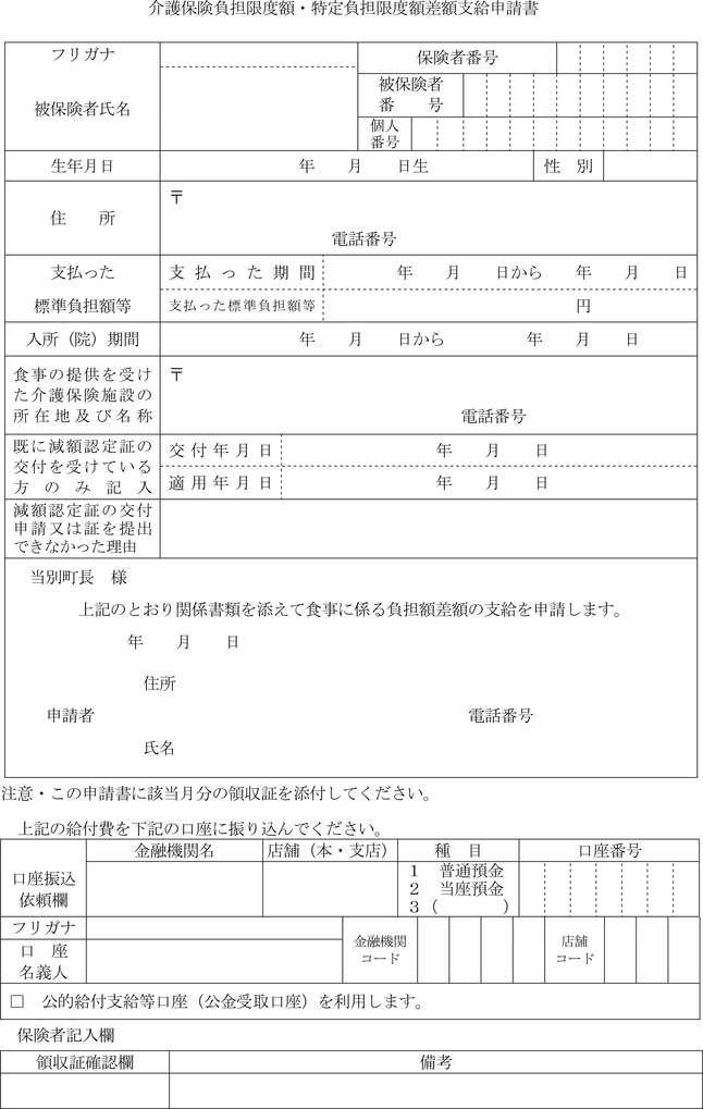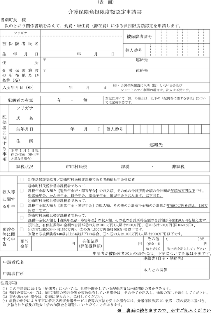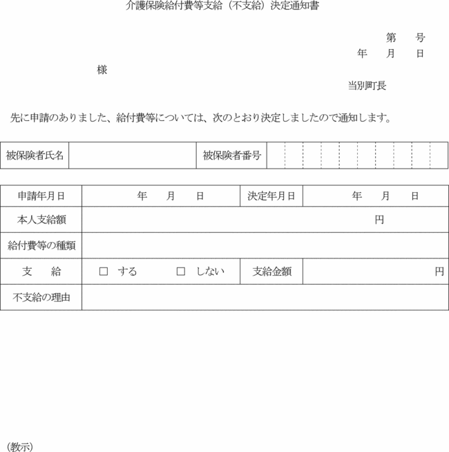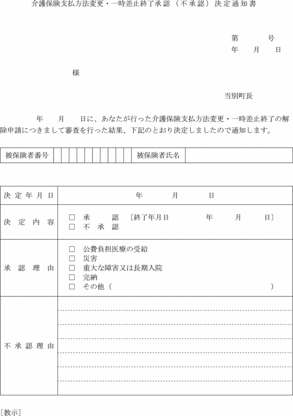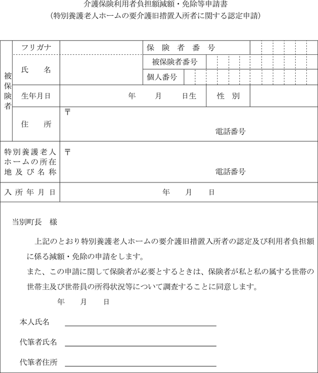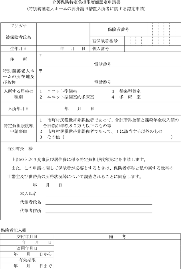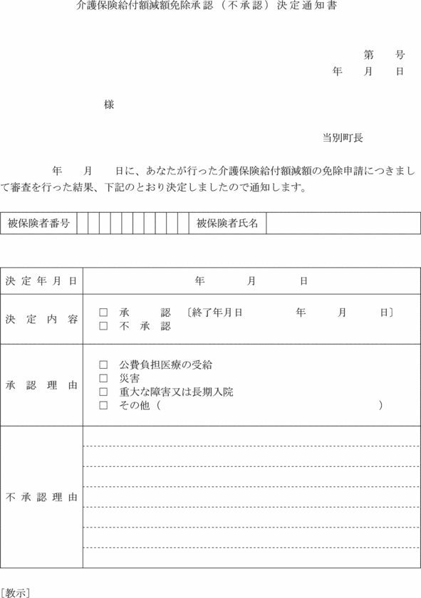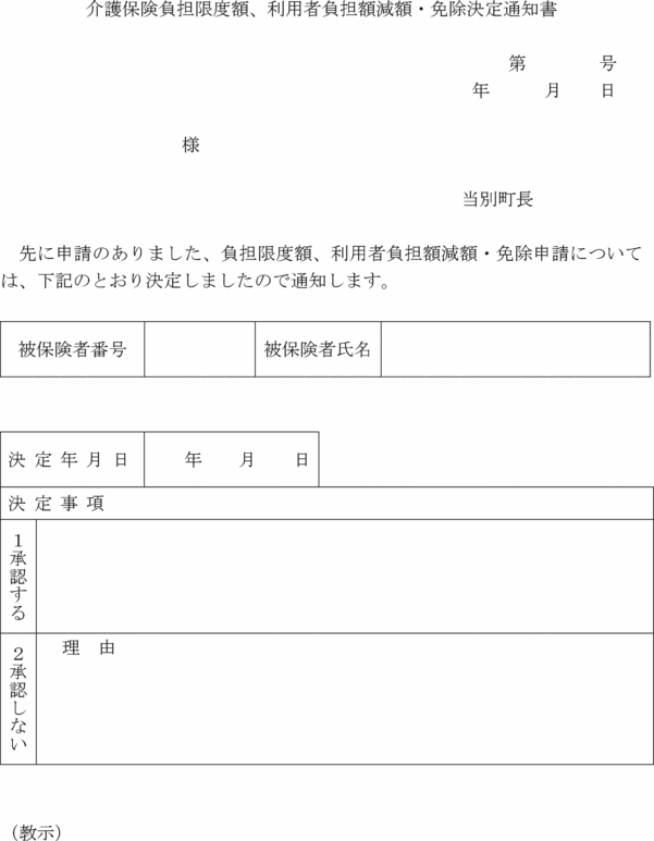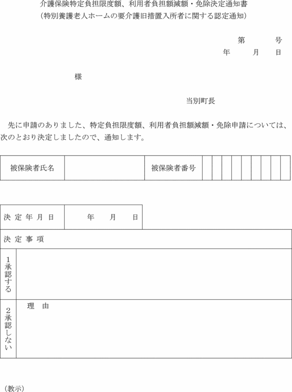2 町長は、前項の申請があった場合は、速やかに審査し、施設介護サービス費の給付の割合の変更の可否を決定し、介護保険特定負担限度額、利用者負担額減額・免除決定通知書(特別養護老人ホームの要介護旧措置入所者に関する認定通知)(