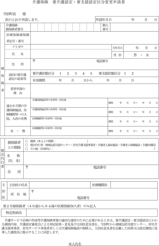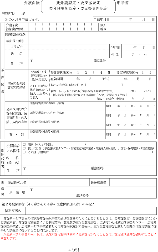 第7条 被保険者のうち、要介護認定、要支援認定、要介護更新認定又は要支援更新認定(「要介護認定等」という。以下この条において同じ。)を受けようとする者は、介護保険要介護認定・要支援認定・要介護更新認定・要支援更新認定申請書(