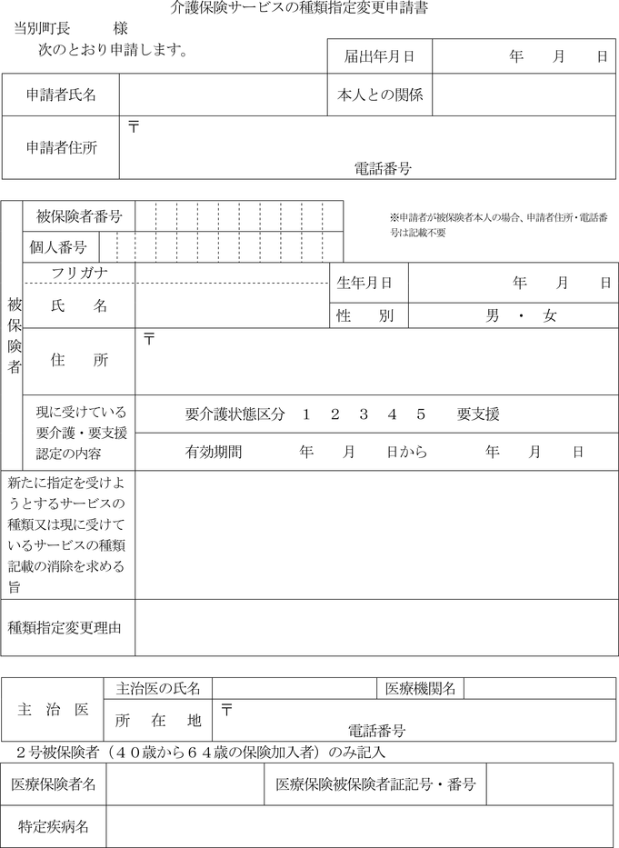 第10条 要介護被保険者等のうち、法第37条第2項の規定により居宅サービス、地域密着型サービス、施設サービス、介護予防サービス又は地域密着型介護予防サービスの種類の変更を受けようとする者は、介護保険サービスの種類指定変更申請書(