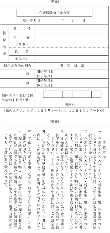 第12条の2 町長は、省令第28条の2第1項の規定により要介護被保険者等に対し、利用者負担の割合を記載した介護保険負担割合証(以下「負担割合証」という。)(