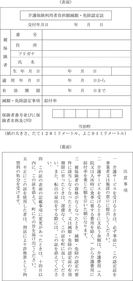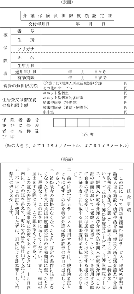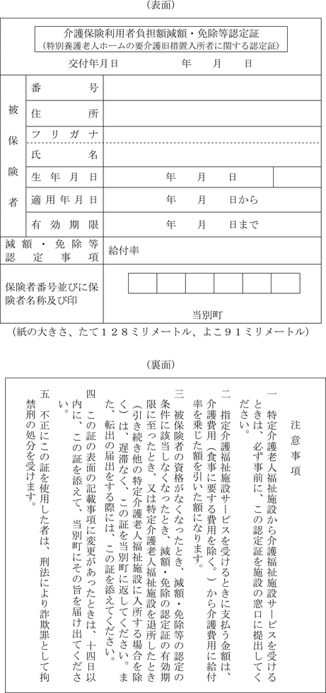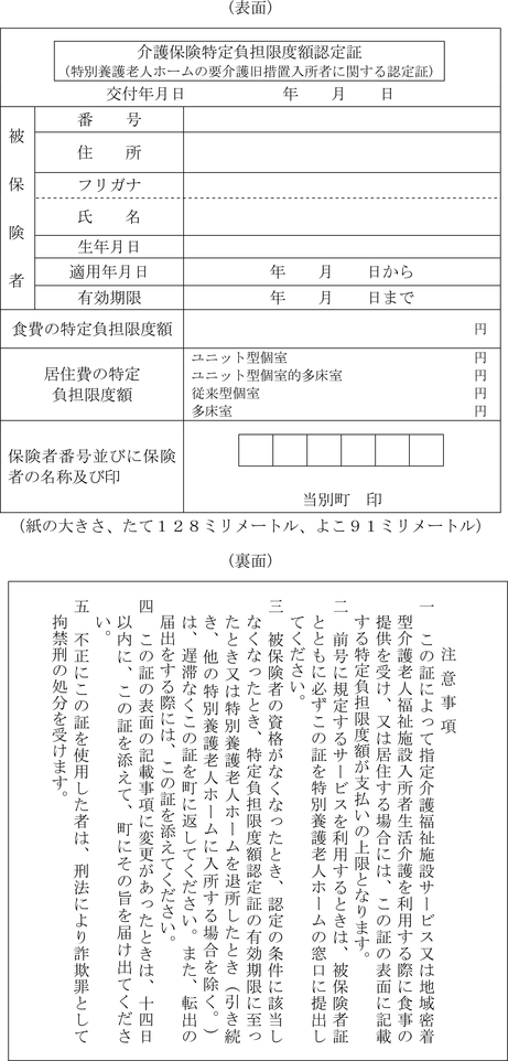 3 町長は、前項の規定により特定負担限度額の減額を承認した場合は、当該申請者に対し介護保険特定負担限度額認定証(特別養護老人ホームの要介護旧措置入所者に関する認定証)(