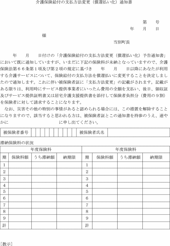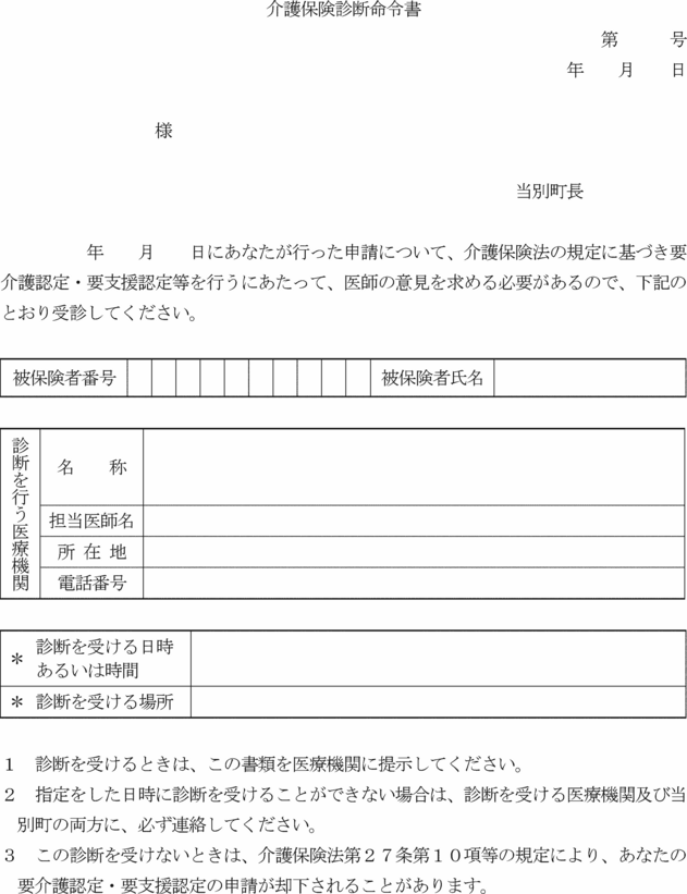 5 町長は、法第30条第1項に規定する要介護状態区分の変更を行うとき、法第29条第1項又は法第30条第2項の規定により準用される法第27条第3項ただし書に該当すると認められる場合は、介護保険診断命令書により当該要介護被保険者に通知するものとする。