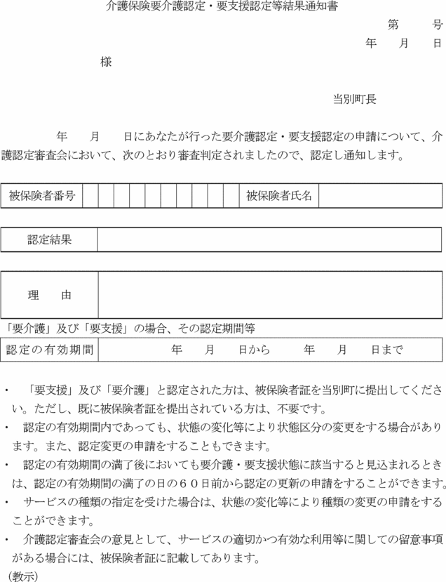 5 町長は、第1項の申請により要介護認定等がなされた場合、要介護認定を受けた被保険者(以下「要介護被保険者」という。)又は要介護認定を受けた被保険者のうち居宅において日常生活を営むもの(以下「居宅要支援被保険者」という。)に該当しないと認められた場合は、介護保険要介護認定・要支援認定等結果通知書(