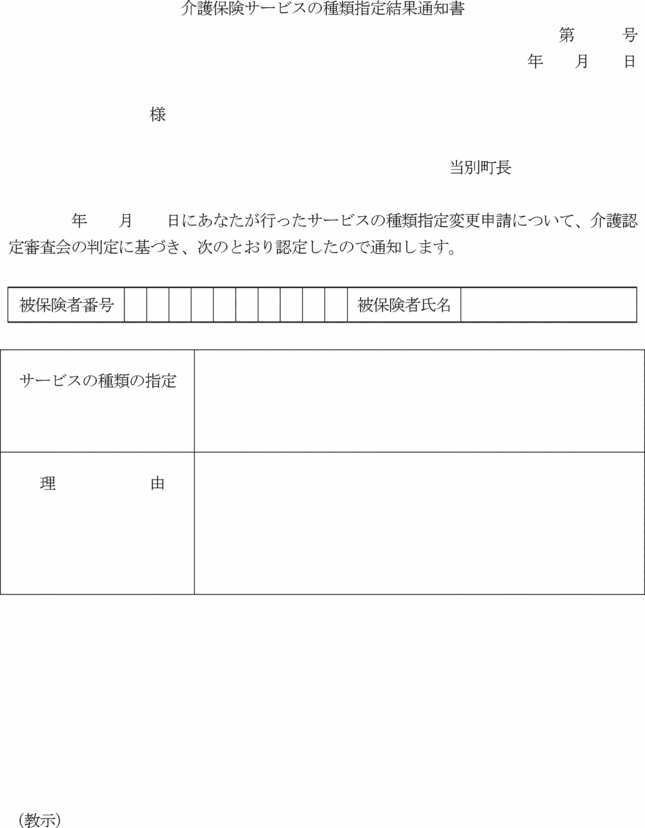 3 町長は、第1項の申請により居宅サービス、地域密着型サービス、施設サービス、介護予防サービス又は地域密着型介護予防サービスの種類が変更された場合又は当該サービスの種類の変更が認められなかった場合は、介護保険サービスの種類指定結果通知書(