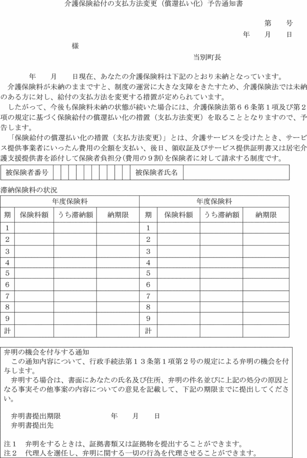 第9条 町長は、法第31条第1項又は第34条第1項の規定により要介護認定の取消し及び要支援認定の取消しを行うとき、法第31条第2項又は法第34条第2項の規定により準用される法第27条第3項のただし書に該当すると認められる場合は、介護保険診断命令書により当該要介護被保険者又は居宅要支援被保険者(以下「要介護被保険者等」という。)に通知するものとする。