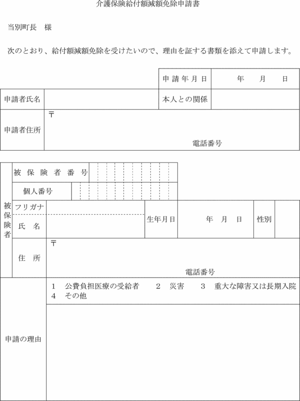 第35条 条例第10条の規定により、保険料の減免を受けようとする者は、介護保険料減免・徴収猶予申請書を町長に提出しなければならない。