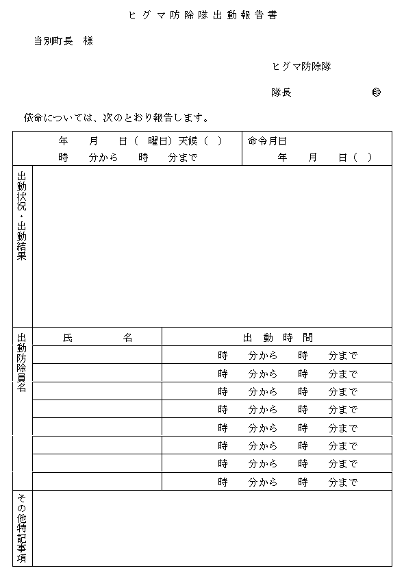 第7条 隊長は、前条の規定により出動した結果をヒグマ防除隊出動報告書(