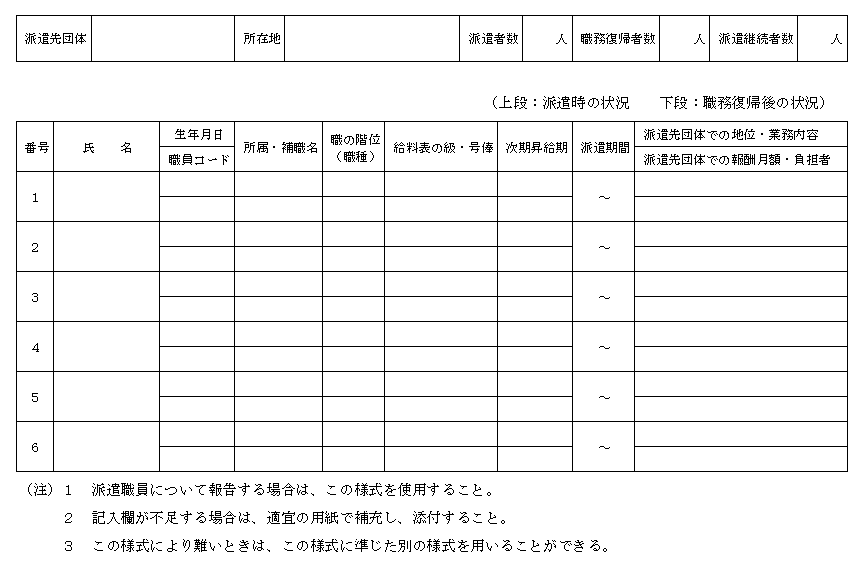 条例第3条第1号に規定する派遣職員(以下「派遣職員」という。)の派遣先団体、派遣期間及び派遣先団体における処遇の状況等並びに派遣職員であって、前年度内に職務に復帰したものの処遇の状況等