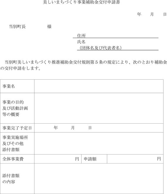 第5条 補助金の交付を受けようとする者は、当該事業の実施前に美しいまちづくり事業補助金交付申請書(