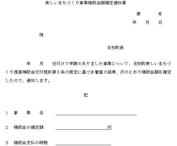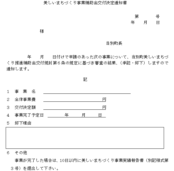 第6条 町長は、前条の規定により申請書を受理したときは、その内容を審査し、美しいまちづくり事業補助金交付決定通知書(