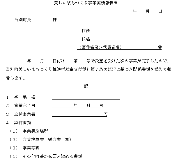 第7条 前条の規定により事業の承認の通知を受けた者(以下「事業者」という。)は、当該事業が完了した日から10日以内に美しいまちづくり事業実績報告書(