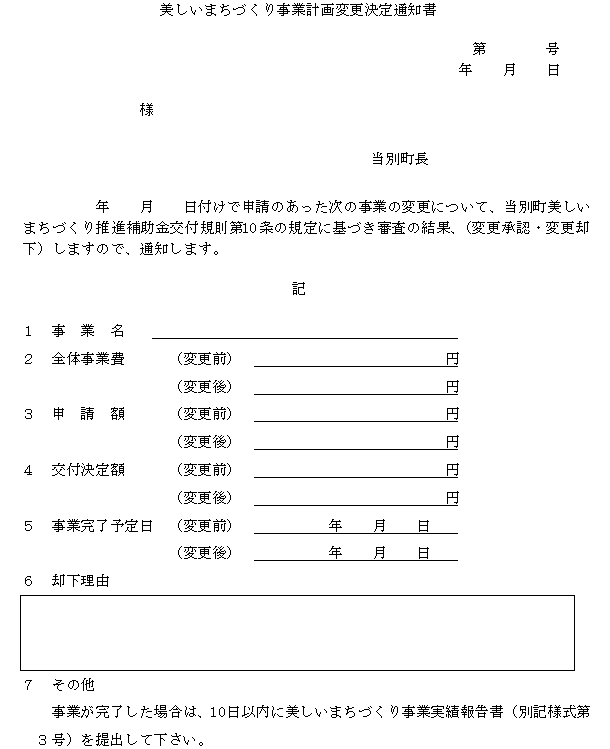 第10条 町長は、前条の規定により計画変更申請書を受理したときは、美しいまちづくり事業計画変更決定通知書(
