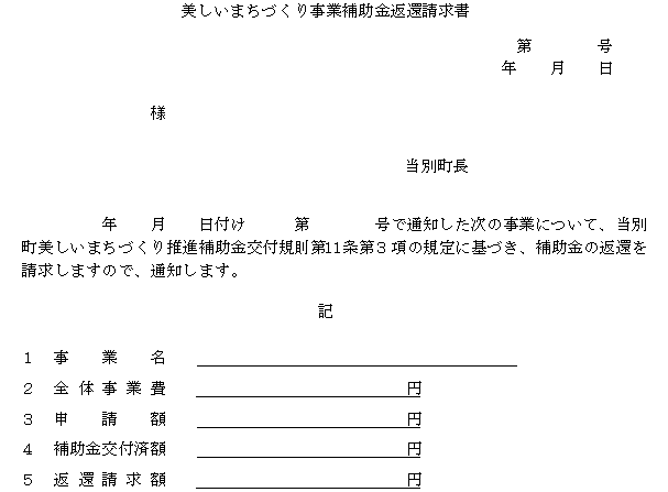 3 前2項の場合において、町長は、補助金の交付後に第1項各号のいずれかに該当することを知ったときは、事業者に対して美しいまちづくり事業補助金返還請求書(