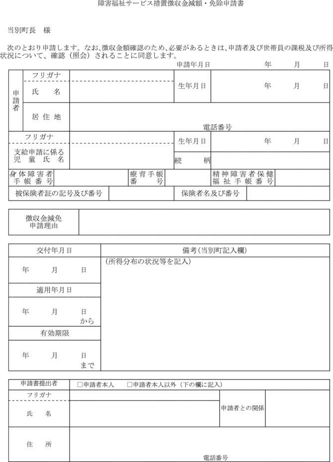第5条 町長が、年度の途中において災害、病気その他やむを得ない事由により納入義務者の収入又は必要経費に著しい変動が生じたため、徴収金を支払うことが困難であると認めた納入義務者で徴収金の免除又は減額の適用を受けようとする者(以下「申請者」という。)は、障害福祉サービスの措置徴収金減額・免除申請書(