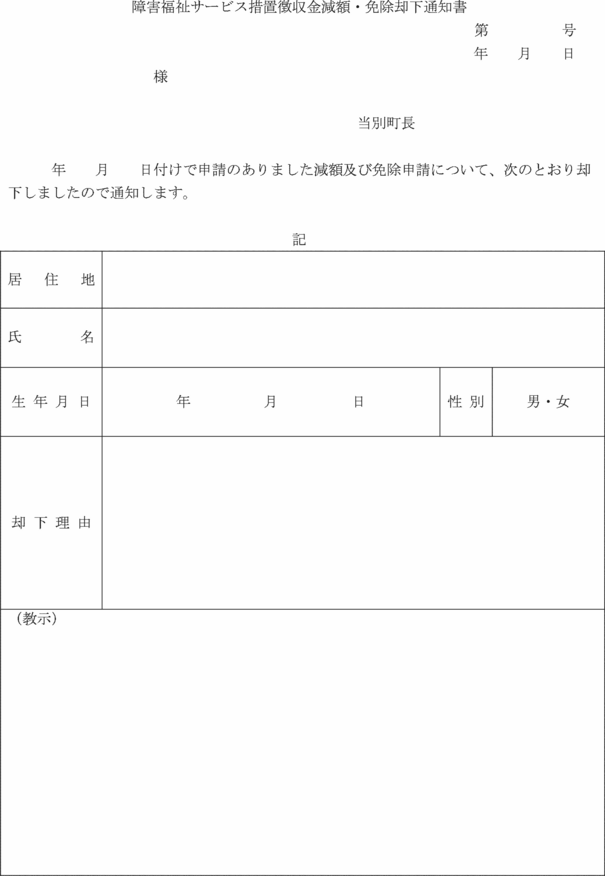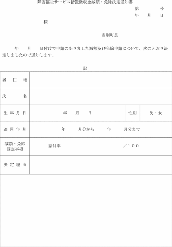 別記様式第2号)を、適用しないことを決定したときは障害福祉サービス措置徴収金減額・免除却下通知書(