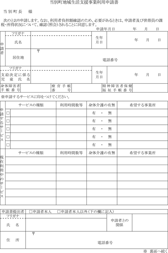 第9条 移動支援事業を利用しようとする障害者等(以下「移動支援事業の利用申請者」という。)は、当別町地域生活支援事業利用申請書(