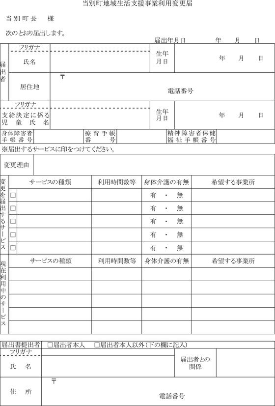 第29条 第10条、第18条及び第24条の規定により決定の通知を受けた者(以下「利用者」という。)は、第9条、第17条及び第23条に規定する申請(以下「利用申請」という。)の内容に変更が生じたときは、当別町地域生活支援事業利用変更届(
