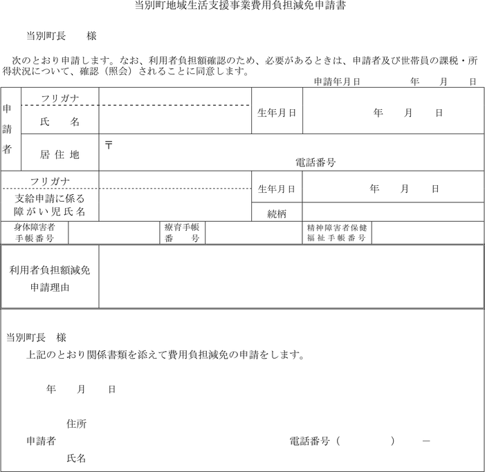2 前項の規定による費用負担額の減免又は免除を受けようとする利用者は、当別町地域生活支援事業費用負担減免申請書(