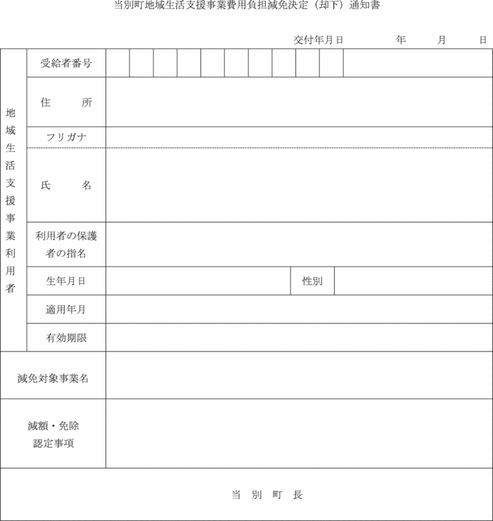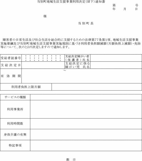 第10条 町長は、前条の申請を受理したときは、その内容を審査し、当別町地域生活支援事業利用決定(却下)通知書(