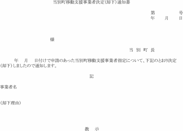 第12条 町長は、前条の申請を受理したときは、その内容を審査し、当別町移動支援事業者決定(却下)通知書(