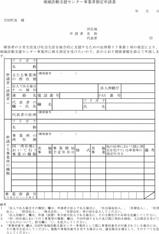 第19条 地域活動支援センター事業を実施する事業者(以下「センター事業者」という。)は、当別町地域活動支援センター事業者指定申請書(