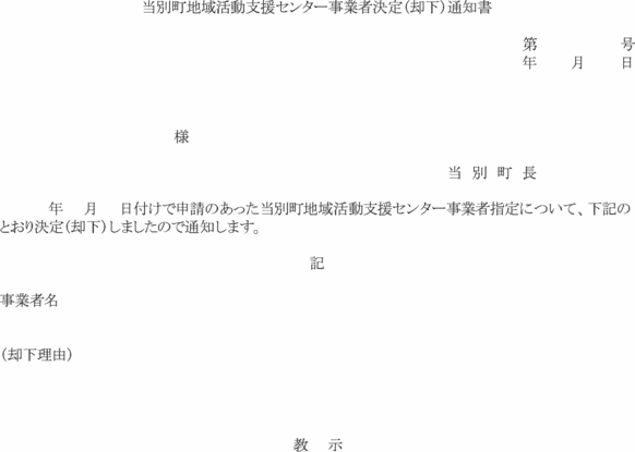 第20条 町長は、前条の申請を受理したときは、当別町地域活動支援センター事業者決定(却下)通知書(