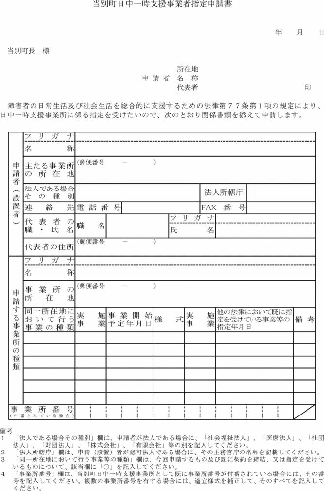 第25条 対象者の利用する日中一時支援事業を提供する事業者(以下「日中一時支援事業者」という。)は、当別町日中一時支援事業者指定申請書(