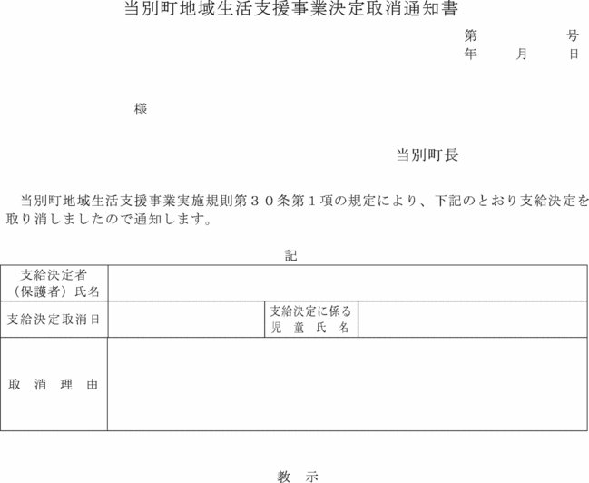 2 町長は、前項の規定による取消しを行なうときは、当別町地域生活支援事業決定取消通知書(