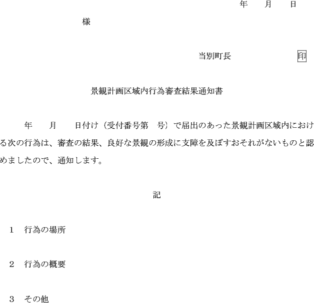 5 町長は、行為の届出等があった場合において、当該行為の届出等に係る行為について、良好な景観の形成に支障を及ぼすおそれがないと認めるときは、景観計画区域内行為審査結果通知書(