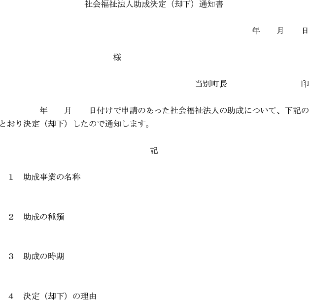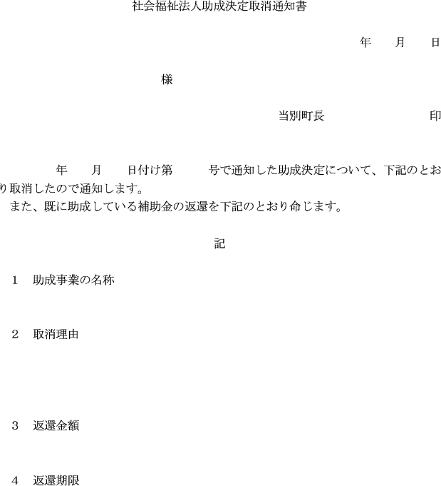 条例第6条の規定による助成の決定を取消し、又は返還を命じるときは、社会福祉法人助成決定取消通知書(