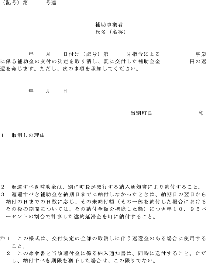 第17条 町長は、補助金等の交付の決定を取り消した場合において、補助事業等の当該取消しに係る部分に関し、既に補助金等が交付されているときは、補助事業者に対し期限を定めてその返還を命ずるものとする。
