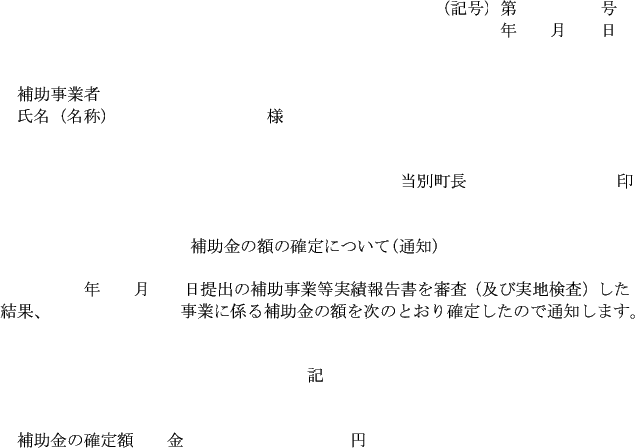第14条 町長は、前条の規定により補助事業等実績報告書の提出を受けた場合においては、当該報告書等の書類の審査及び必要に応じて行う現地調査等により、その報告に係る補助事業等の成果が補助金等の交付の決定の内容及びこれに付した条件に適合するものであるかどうかを確認し、適合すると認めたときは、交付すべき補助金等の額を確定し、当該補助事業者に対し、補助金の額の確定について(通知)(