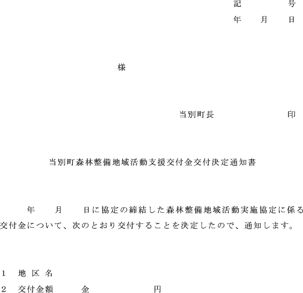 第5条 町長は、対象行為の実施状況について、交付対象者から前条の報告を受け、その内容を確認した後、対象行為が適正に実施されていると認められる場合には、交付金の額を決定し、森林整備地域活動支援交付金交付決定通知書(