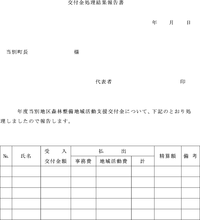 別記様式第6号)により町長が別に指定する期日までに町長に交付金の処理結果を報告するものとする。