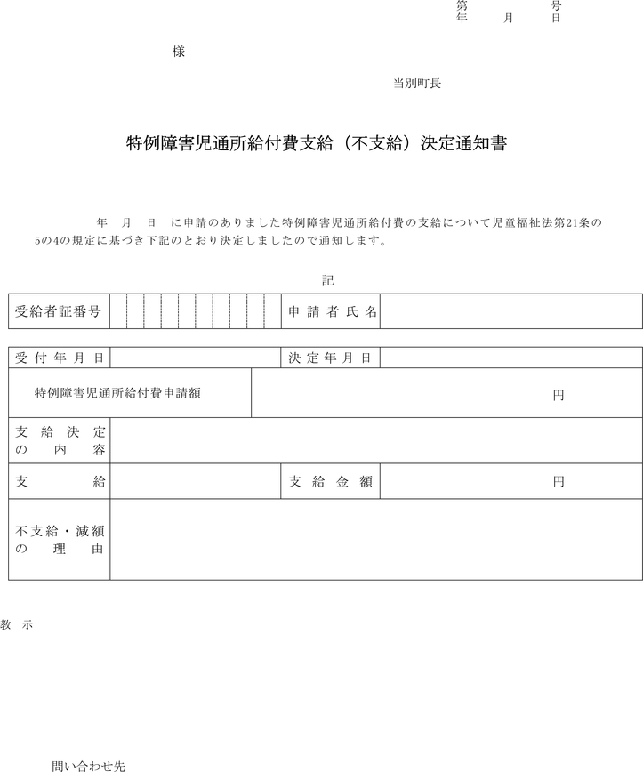 第7条 町長は、前条の申請に対し、支給の要否を決定したときは、特例障害児通所給付費支給(不支給)決定通知書(