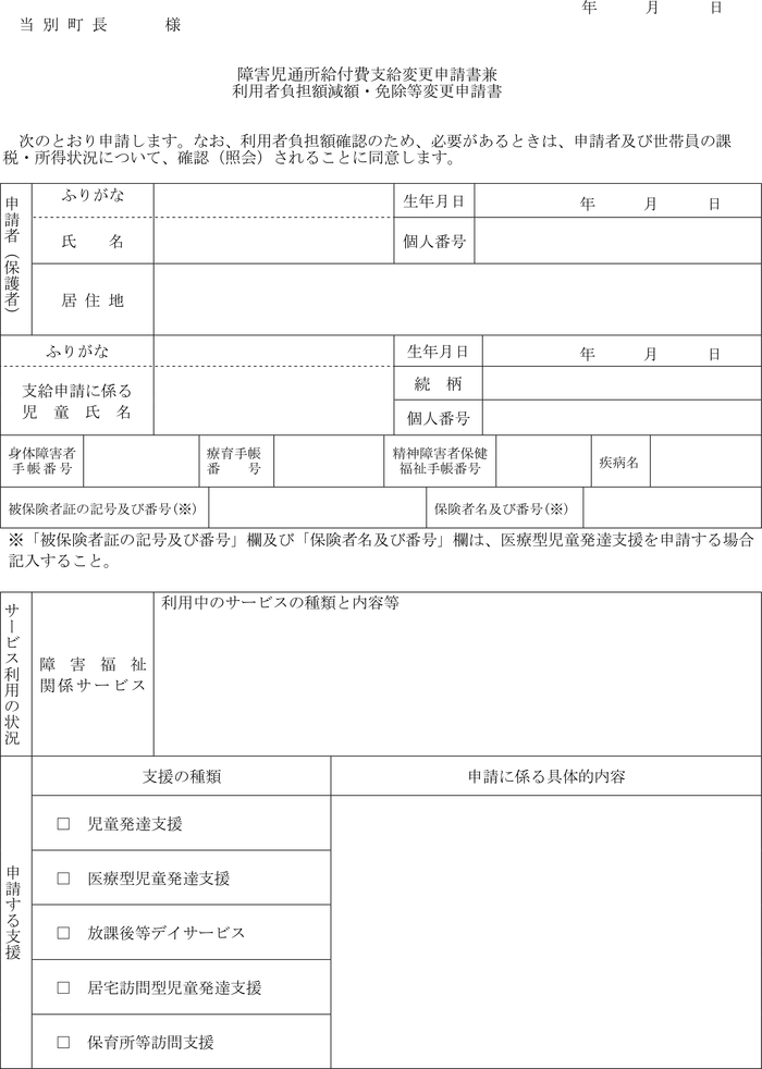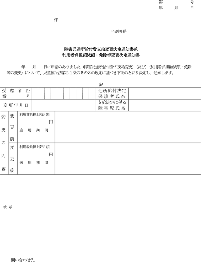 第10条 町長は、前条の申請又は職権により支給決定を変更したときは、障害児通所給付費支給変更決定通知書兼利用者負担額減額・免除等変更決定通知書(