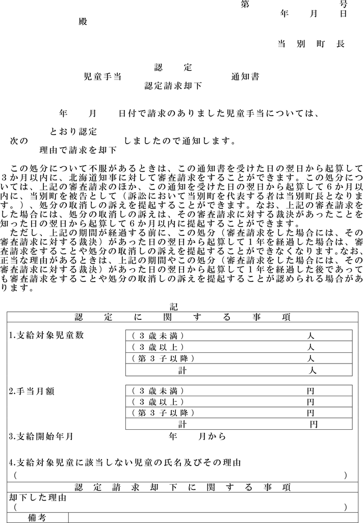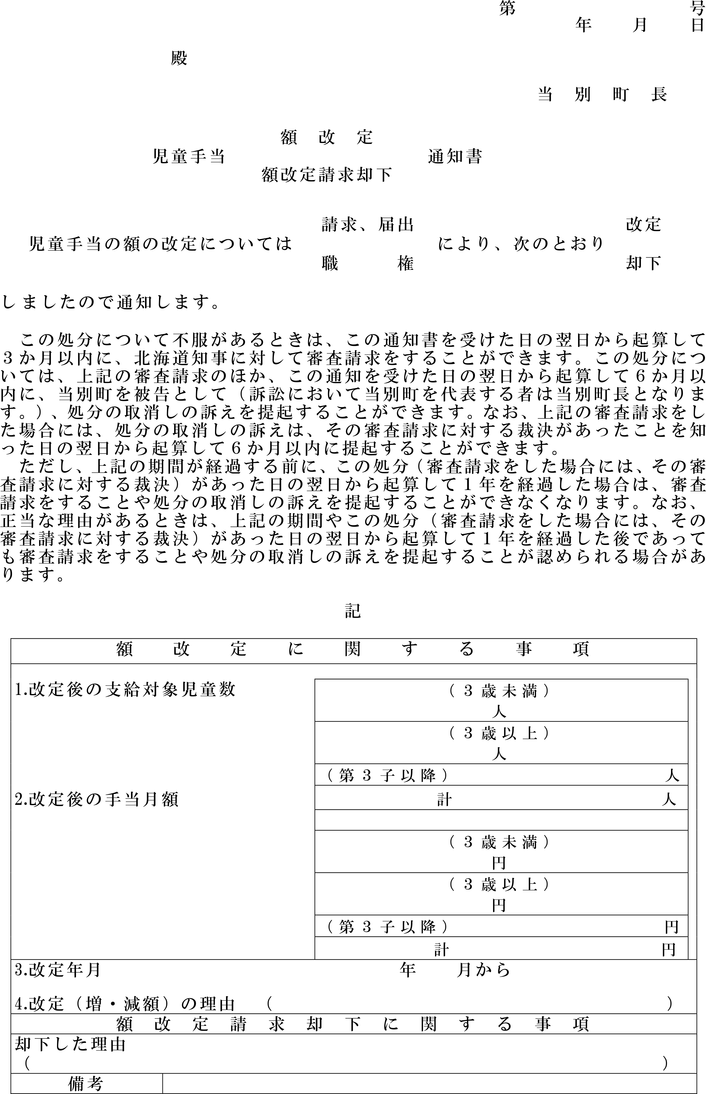 第3条 町長は、一般受給資格者として児童手当等の支給を受けている者(以下「一般受給者」という。)から施行規則第2条第1項の児童手当額改定認定請求書の提出を受けたときは、その内容を審査し、児童手当額改定・額改定請求却下通知書(
