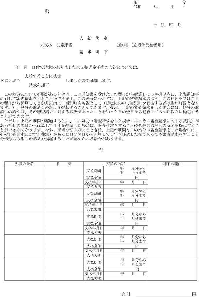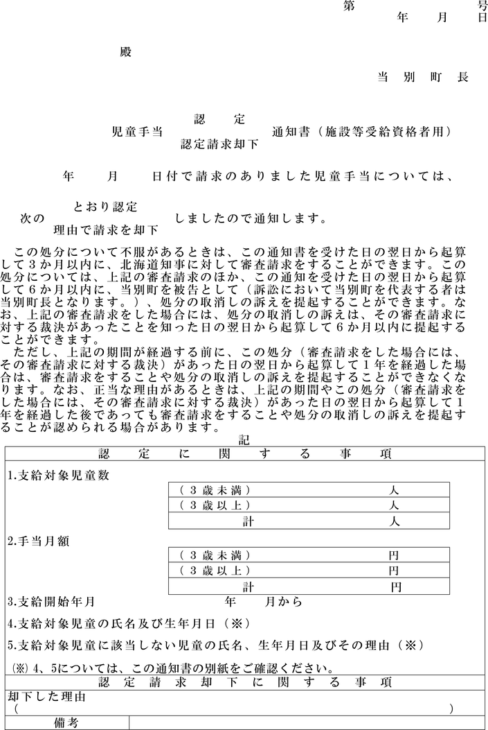 2 町長は、施行規則第9条第2項の未支払児童手当請求書(施設等受給資格者用)の提出を受けたときは、その内容を審査し、未支払児童手当支給決定・請求却下通知書(施設等受給資格者用)(
