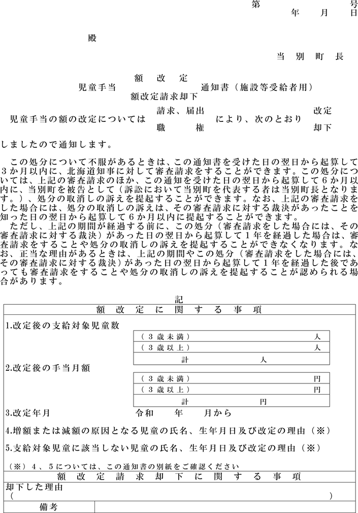 3 町長は、一般受給者及び施設等受給者(以下「受給者」という。)から施行規則第3条第1項の児童手当額改定届又は同条第2項の児童手当額改定届(施設等受給者用)の提出がない場合であっても、公簿等によって児童手当等の額(以下「手当額」という。)を減額すべきものと確認したときは、職権に基づいてその額を改定し、児童手当額改定・額改定請求却下通知書又は児童手当額改定・額改定請求却下通知書(施設等受給者用)により当該受給者に通知するものとする。