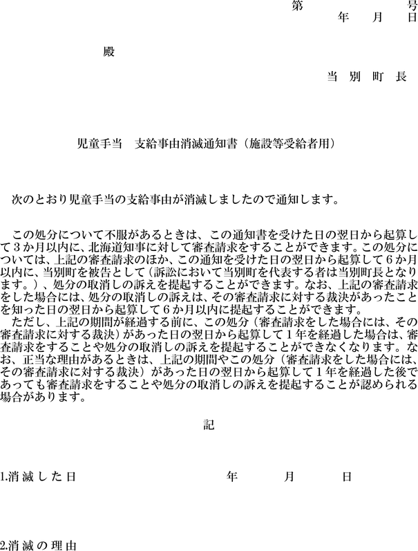 3 町長は、受給者から施行規則第7条第1項の児童手当受給事由消滅届又は同条第2項の児童手当受給事由消滅届(施設等受給者用)の提出がない場合であっても、公簿等によって児童手当等の支給事由が消滅したものと確認したときは、職権に基づいて当該手当の認定を取り消し、児童手当受給事由消滅通知書又は児童手当受給事由消滅通知書(施設等受給者用)により当該受給者に通知するものとする。